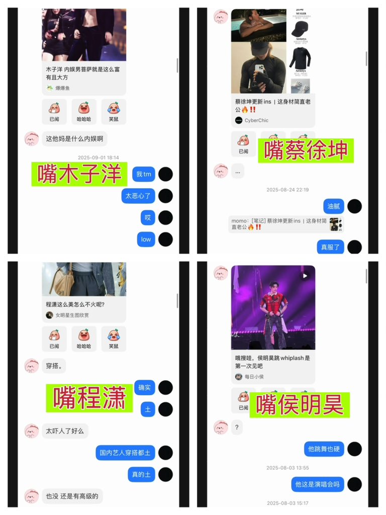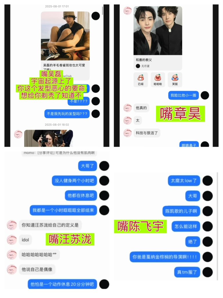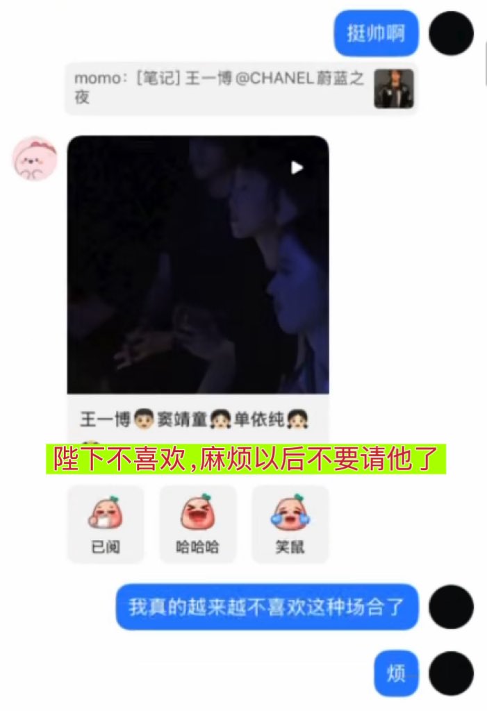 今晨,疑为王一博小号与前女友綦美合的聊天记录登上微博热搜。平日高冷的王在记录中显得八卦且直言,谈及多位圈内人:质疑辣目洋子入圈合理性、称汪苏泷非真正偶像、批蔡徐坤“油腻”,并指责肖战的头型、肩部比例及作品质量。